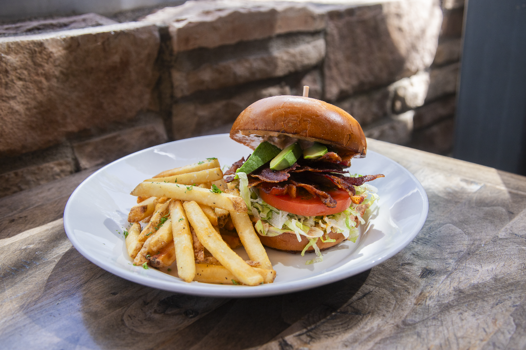 Beer-brined bacon, shredded lettuce, seasoned tomatoes, avocado, smokey ale mayo, fries.