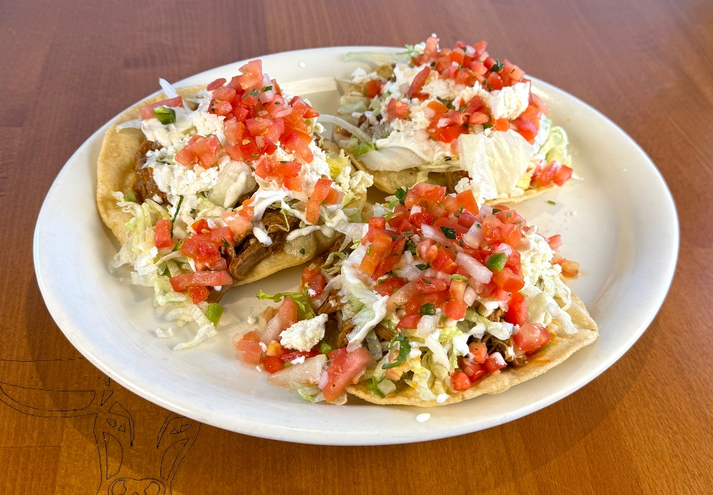 beef tinga, corn tortillas, lettuce, pico, creama, queso fresco