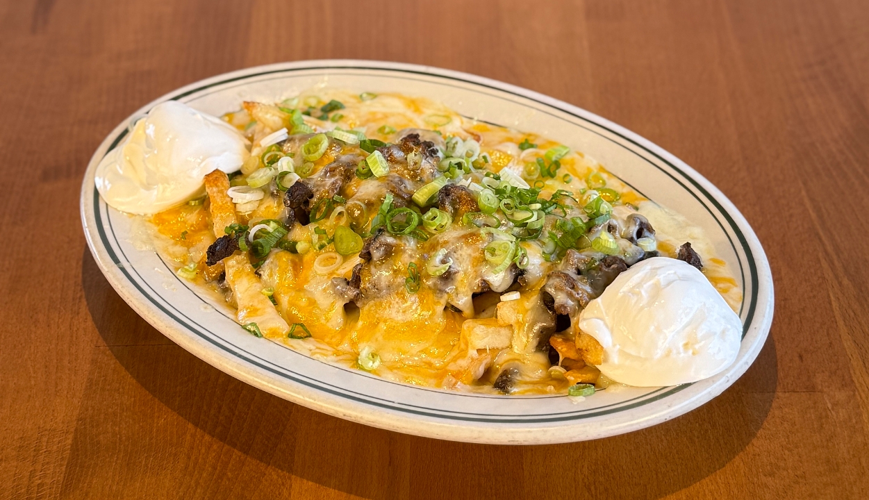 carne asada, fries, cheese, pico, avocado sauce, sour cream, one side