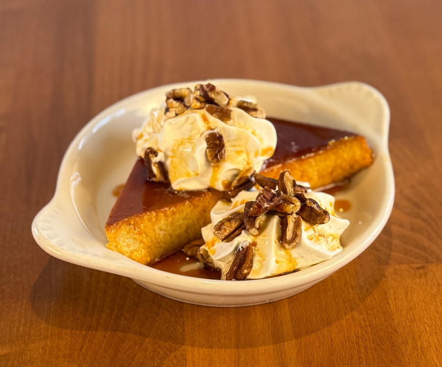 house made flan, pumpkin, caramel, candied pecans, whipped cream