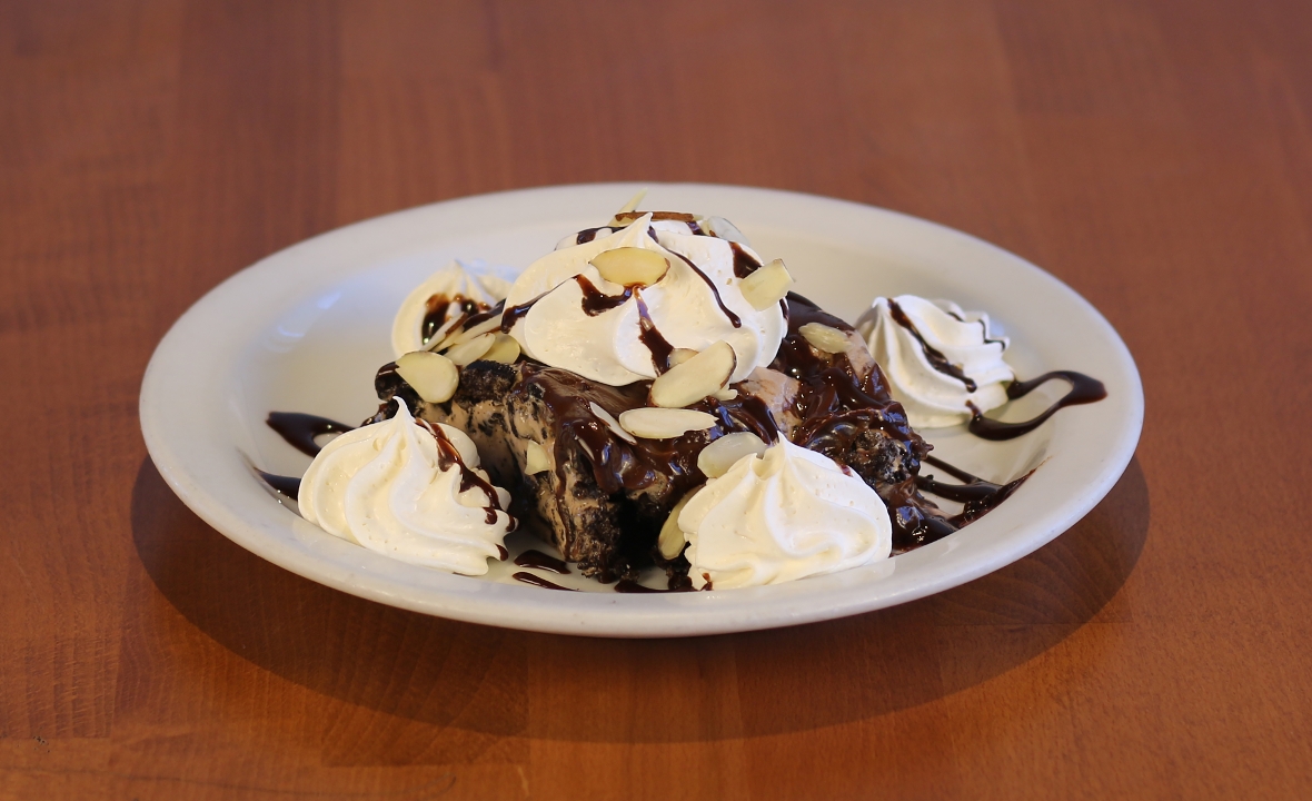 mocha almond fudge ice cream, cookie crust, whipped cream, sliced almonds, chocolate