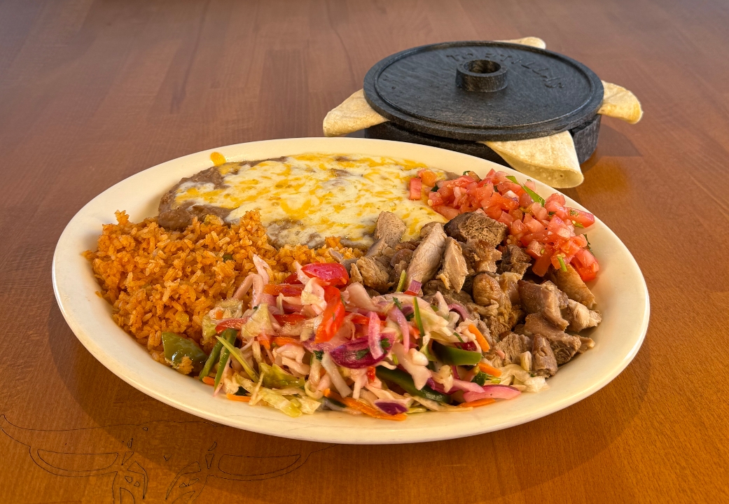 tender, slow-braised pork, jalapeno slaw, pico, two sides, tortillas